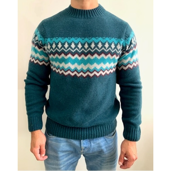 Camisola em tons de azul, roxo e branco, com padrão zigzag no peito e nos ombros, combinando originalidade e sofisticação para um visual contemporâneo e refinado.
